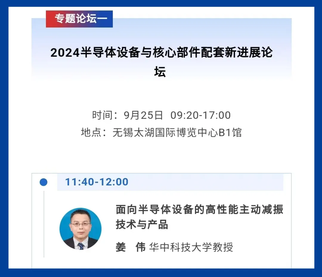 同時,華中科技大學(xué)教授、教育部“長江學(xué)者”特聘教授兼格藍若技術(shù)顧問姜偉將于2024年9月25日在B1館進行關(guān)于“面向半導(dǎo)體設(shè)備的高性能主動減振技術(shù)與產(chǎn)品”專題演講,為大家科普主動減振技術(shù)最前沿的知識體系。